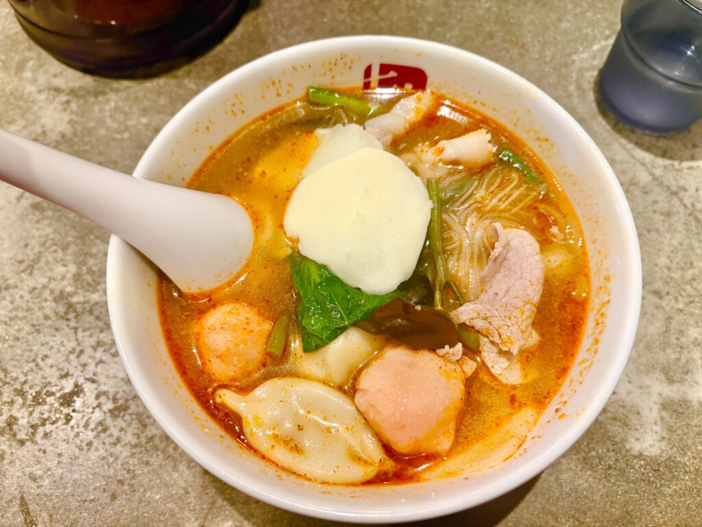 私が入れたトッピングは、ほうれん草・山菜・きくらげ・水餃子・小籠包・エビ団子・豚バラ肉。そしてクーポンのモッツァレラチーズです。結果的にめっちゃいっぱい入れました(笑)具材をいっぱい入れたけど、多いほど食べ応えがあって美味しいと思います。