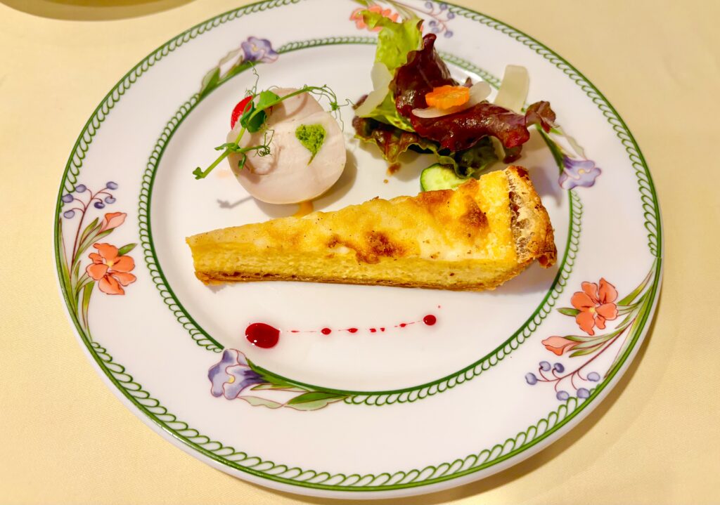 まずは前菜の持ち合わせが運ばれてきました。左上が津軽鶏のロール香草風味、右がサラダ、下がじゃがいものキッシュです。小さいサイズのホタテのサーモン巻きもあったのですが、それは彼の方に提供されていました。(私達が途中で席を変わったから、混乱させてスミマセン)