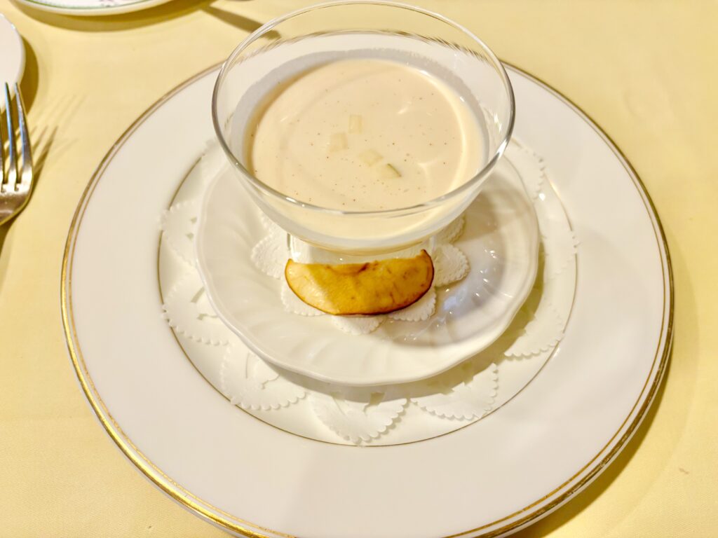 食べログの口コミには「フルーチェみたい!」と書いている人が居て、確かにその通りでフルーチェをもっと高級にした感じでした。とろっとしたテクスチャーでりんごの味がしっかりして、とっても美味しい。これは弘前フレンチならではの味わいで大満足でした。スープの器の下にドライフルーツのりんごも添えられていました。