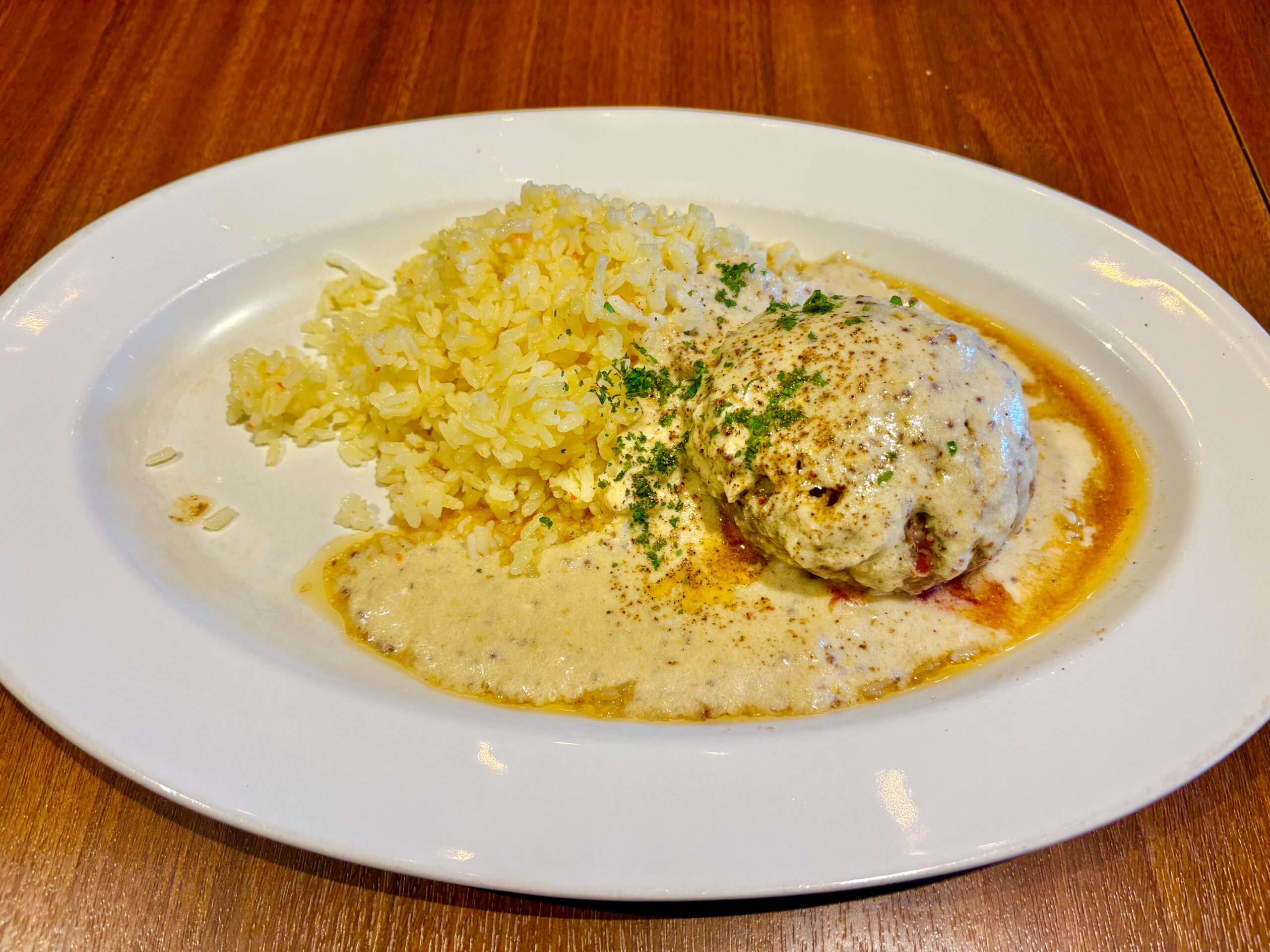 ハンバーグソースにはクリームソースとマスタードが使われていて、特徴的な唯一無二のソースです。添えられたバターライスとともに美味しすぎる!!